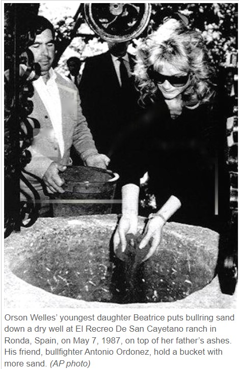 There’s a monument today in Ronda which was unveiled in September 2015, 30 years after his death. But his tomb is elsewhere, not far from Ronda, though. The fountain which holds the ashes of Orson Welles and his wife Paola Mori is located five kilometers outside of Ronda on the A-367, towards Cuevas del Becerro. In May 1987, Beatrice Welles brought her father’s ashes to the Ronda ranch of his longtime friend, bullfighter Antonio Ordoñez. The legendary matador died in 1998 and some of his ashes were later interred in the same well as his late friend at El Recreo De San Cayetano ranch.